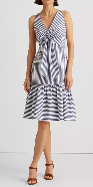 Starting with the scoop neckline and v neckline- these two are going to help you to create some balance around your top half and keep your shoulders looking even broader than they are. For V neckline, you can try this Tie Front Crepe Dress ($98.99).